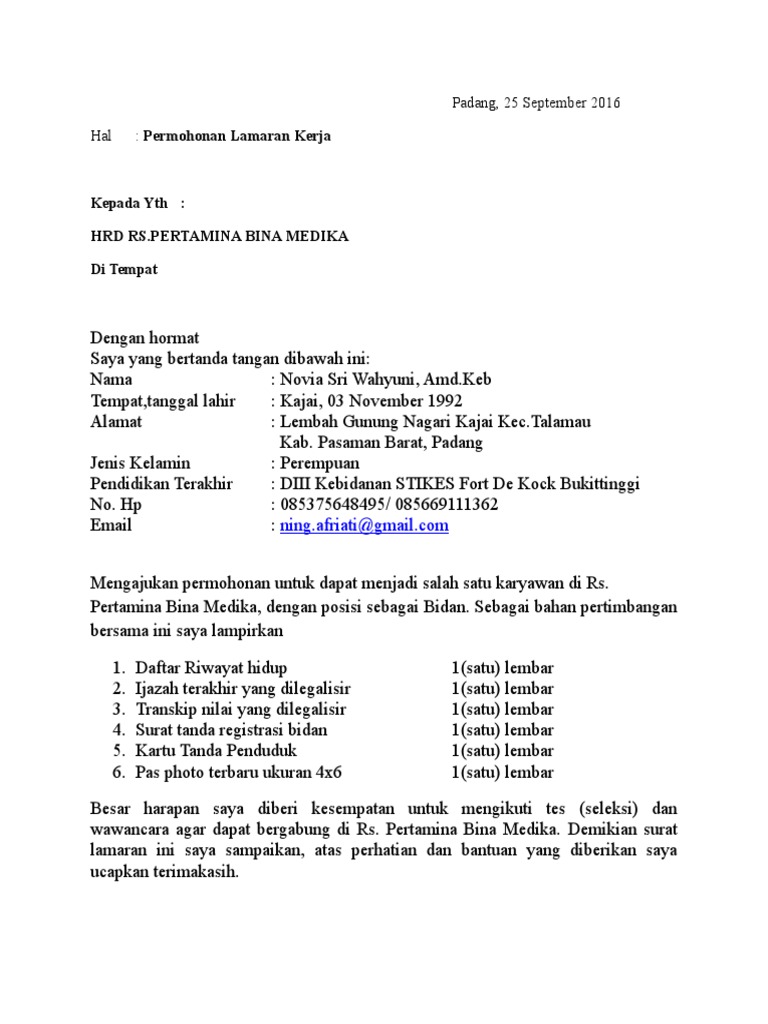 Pengertian surat lamaran, surat pengantar, surat motivasi merupakan sebuah surat pengantar yang melekat pada, atau yang menyertai dokumen lain misalnya … surat lamaran bisa juga berguna sebagai pemasaran perangkat bagi calon pencari kerja. Langsung saja yuk simak penjelasan sekaligus contoh surat lamaran kerja bumn berikut ini. Contoh surat lamaran kerja pertamina. Akan tetapi, terkadang kita luput bahwa hal yang esensial bukan hanya soal ketertarikan kita pada pekerjaan yang dilamar tersebut. Demikian surat lamaran kerja ini saya buat berdasarkan kondisi saya yang sebenarnya. Contoh surat lamaran kerja kedua ini, cocok buat yang telah punya pengalaman kerja beberapa tahun sebelumnya di perusahaan lain baik itu sesuai dengan pekerjaan yang ingin diambil ataupun tidak. Bapak/ibu manager personalia pt.spbu pertamina. Savesave contoh surat lamaran & cv pt pertamina ep for later. Setiap tahun semakin banyak mahasiswa yang mendapatkan gelar sarjana. Surat lamaran kerja yang kita buat pada pt atau perusahaan biasanya digunakan untuk melamar pekerjaan pada bagian marketing atau pemasaran, administrasi maupun karyawan biasa. Contoh surat lamaran kerja yang baik dan benar untuk dijadikan referensi dalam usaha mencari kerja di sebuah perusahaan sesuai dengan keahlian kamu. Anda dapat menyesuaikan dan mengembangkan sesuai dengan jenis kualifikasi pekerjaan/posisi pekerjaan yang anda lamar, baik lowongan kerja khusus atau pun umum. Pertamina pada saat ini sedang membutuhkan tenaga kerja di berbagai posisi, maka saya yang bertanda tangan di bawah ini.